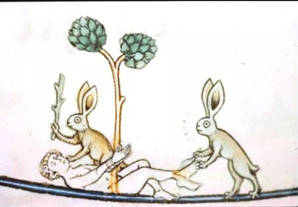 Rabbits and hares do sometimes appear in Mediaeval manuscripts, illustrating the Seasons, and suggestive of Nature’s abundance, and there is, rather curiously, a whole tradition of violent rabbits in Mediaeval Manuscripts, representing an allegory of “the World Turned upside down”, where the supposedly meek, wreak their revenge on their historic tormentors: