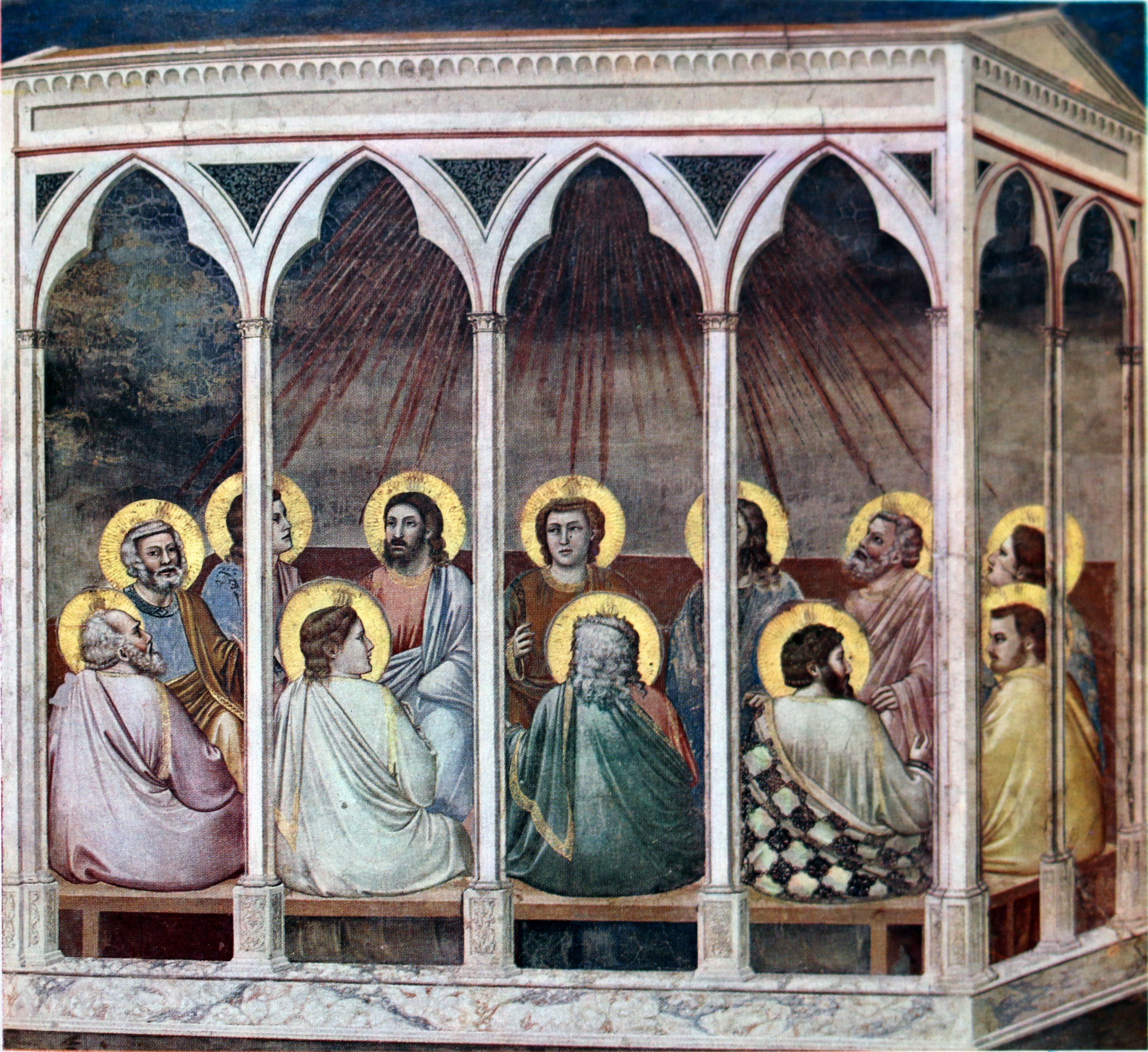 If we compare our first depiction of the Pentecost from the Bible of San Callisto, Reims, with Giotto’s version around 530 years later, we can see evidently how Giotto has mastered spatial illusion and narrative clarity.