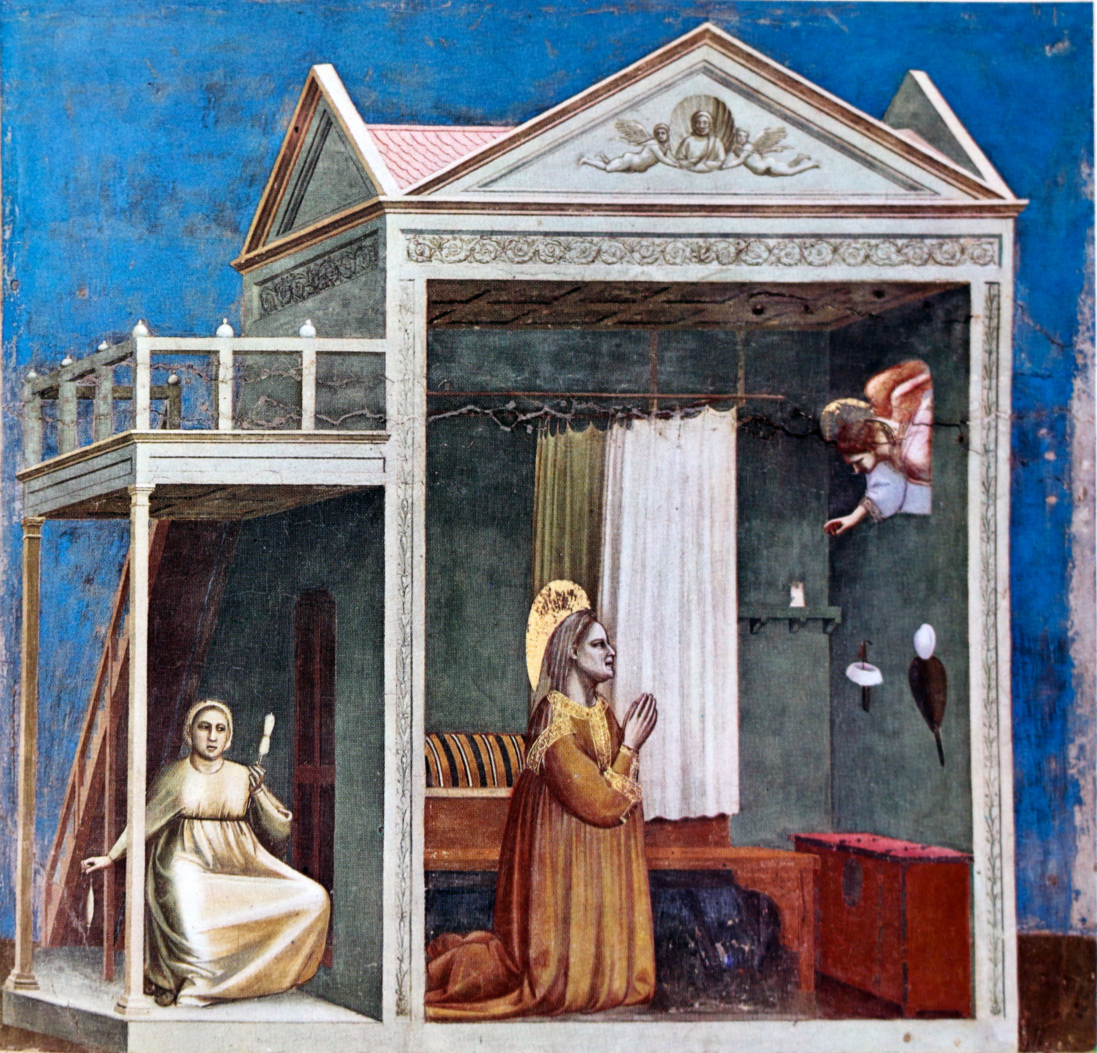 To the left the angel and Mary are only just ‘anchored’ to the ground, and behind them is an impenetrable wall of flatness. Around their necks and draperies are vestigial shadows that suggest three dimensional form, but the figures are essentially flat and hieratic, like the Byzantine icon painting tradition from which they emerge. To the right, the walled city of Nazareth is depicted using the new tradition of spatial representation: the nearest planes are presented parallel to the picture surface, and the ‘receding’ planes sloping off diagonally to the right. Roofs are seen consistently from the top right, looking left and down, in a convincing quasi-perspective. Only the arched portal has proven a little awkward, spatially. The left and right sections of the composition are in contradiction. They use different conventions of space. The left decides on frontal, iconic representation which has no need of an illusionistic background, which could as well be painted in gold, as in an icon. The right hand side chooses space and recessive illusion.