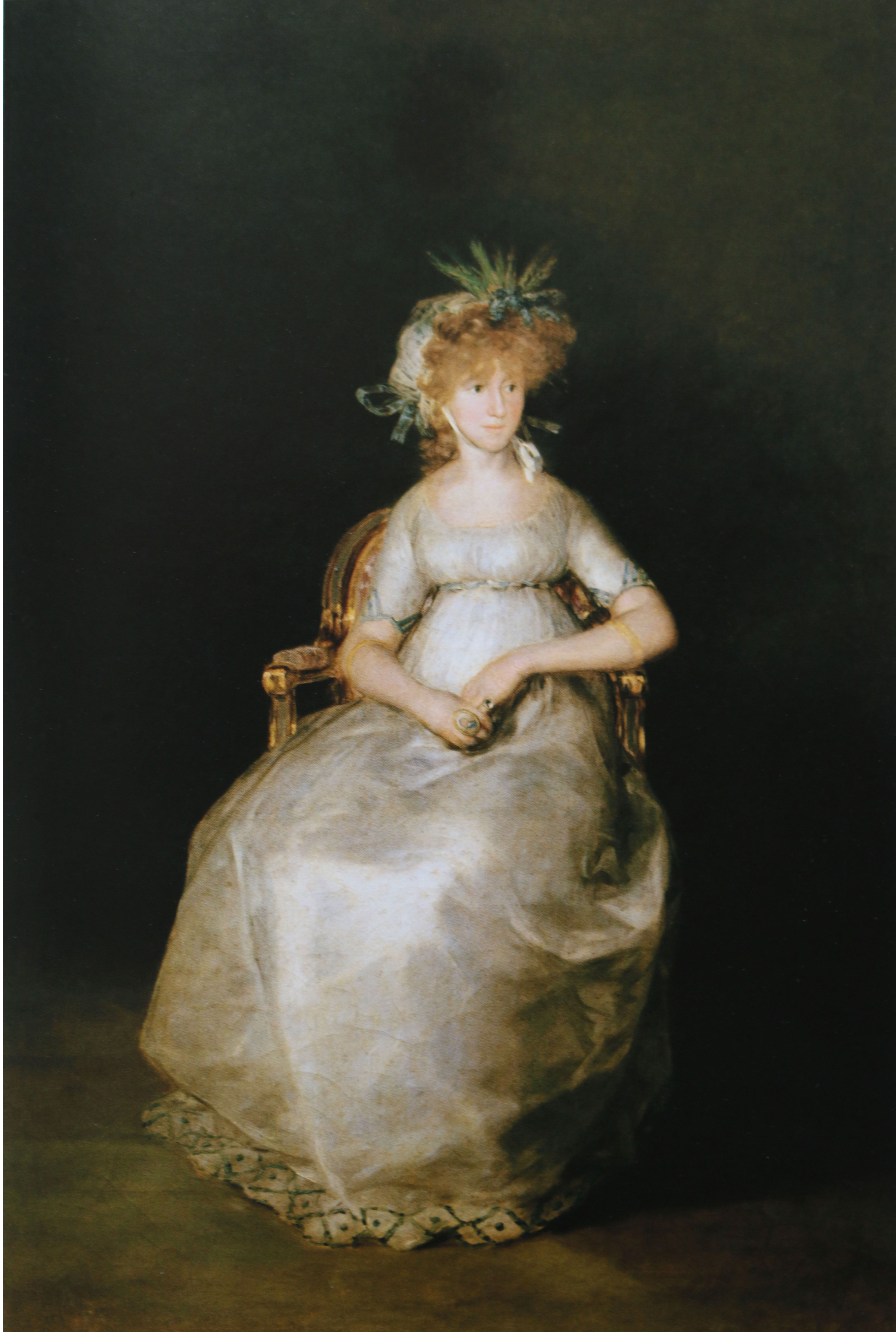 In this understated sumptuous masterpiece, Goya demonstrates the virtuosity and subtlety of expression which his use of grey and pink permitted him. He had known and painted María Teresa de Borbón y Vallabriga (1779-1828) as a little girl. Daughter of the Infante Don Luis, by a morganatic marriage, she could not inherit her father’s titles and had been banished form court to be educated at a convent in Toledo. Her marriage to Don Manuel Francisco Domingo de Godoy, the Prime Minister and most powerful politician of his day, enabled her to escape her cloistered existence and enter court life. But the marriage was a manipulation by Queen María Luisa, probably intended to separate Godoy, possibly the lover of Maria Luisa herself, from his latest lover Josefa (Pepita) Tudó to whom he had been in thrall since 1796. Godoy was thus able to marry into the Royal family whilst maintaining his mistress, whom he eventually married after the death of Maria Teresa. By all accounts, Maria Teresa loved her errant husband dearly. Jovellanos recounted how painful it was to sit opposite Godoy at dinner with his wife on one side and his lover on the other” “The spectacle filled me with sadness; it was more than my heart could bear. I could neither speak nor eat nor think straight. I fled the scene.”