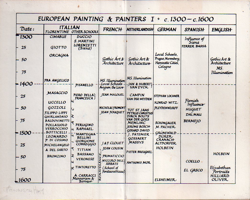 Almost the first art-book I bought, about 1968 when I was 13, was this little gem by William Gaunt (1959, reprinted 1968) for 6 shillings (£0.30, but probably more like £6.00 in relative value now). I bought it partly for the cover, which I instantly loved, because it straightaway told me that painting was about colour; and partly for the charts on the inside endpapers, which seemed to make the entire History of Art accessible, logical and easy to follow: