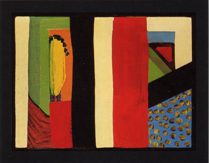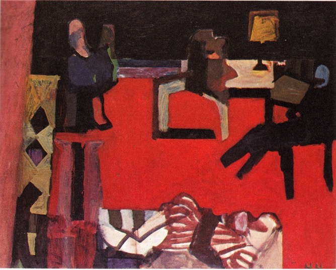 In Hodgkin’s early work, the figurative starting point is still fairly evident. Here an interior with red carpet, a reclining female figure in striped dress in the foreground, a seated male figure to the right, behind him a table and desk lamp, on to the left another seated, possibly female figure. As the image has progressed over time, Hodgkin has slowly begun to efface the figurative elements, leaving just enough information for us to grasp the sense of an occupied interior space. The redness of the carpet has begun to pull away from the distance and float to the surface as he re-emphasises its flatness, as in Matisse had done in his “Red Studio”.