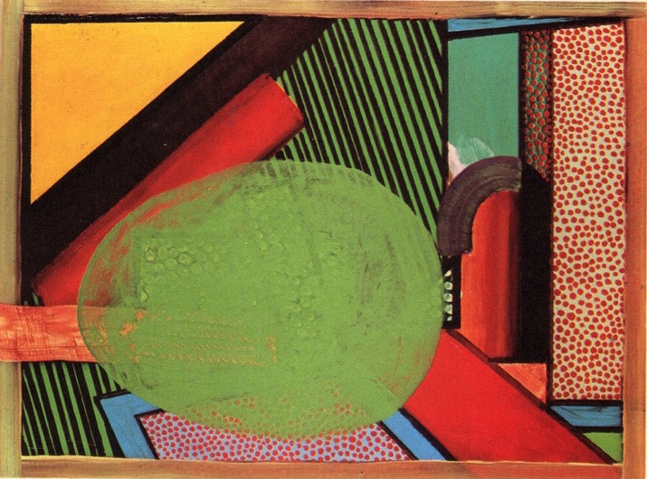 Critics often confused Hodgkin, in his early career, with the ‘Pop artists’ who were his contemporaries, and although he was always a more ‘classical’ painter, whose concerns were primarily with the interface between abstraction and figuration, he did nevertheless derive some of his stylistic tropes from Pop Art – In the Caulfield above, the artist plays with multiple forms of representation in the same image. Although discrete parts of the image are painted using different visual conventions: a ‘posterised graphic’ style, a flat decorative style, and photo-illusionistic painting, the drawing nevertheless unifies the composition, and we have no difficulty in ‘reading’ it as one image.