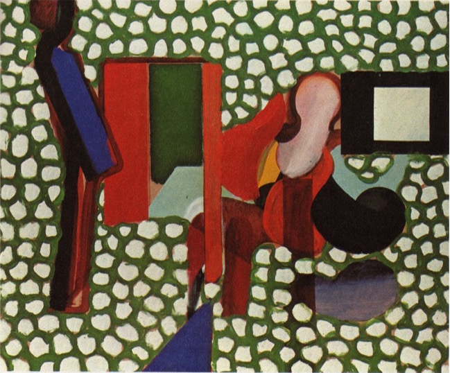 From Juan Gris, but also from the later Synthetic and Rococo Cubist work of Picasso and Braque from the 1920s, Hodgkin has drawn certain elements of his visual range. (Note that I do not use the erroneous term ‘visual language’ of which there can be no such thing: a language requires a grammar and a syntax, and visual art operates on much more ambiguous ways). But the way in which Gris uses areas of solid colour to suggest solidity and opaque planes, and areas of dotted colour, to suggest more airy, insubstantial matter, Hodgkin adapts frequently to imply differences in substance/materiality, for example the ‘buzz’ of conversation in an interior space.