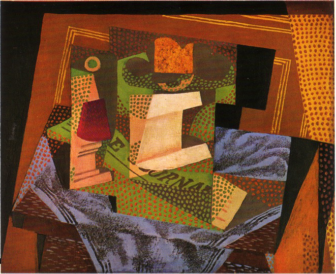 The Image comes from an excellent survey book, “20,000 years of world painting’ by P.P.Kahane, P.Francastel, G.C.Argan, Michael Levey, Hans L.C.Jaffé and H.Hetl-Kunze, Harry N Abrams, NY, (1967) which filled many of the gaps, though not all, of Gaunt’s little book. Up in Inverness, Scotland, as a young teenager in the 1960s and 1970s, I had not, until then, been exposed to Cubism, and this image, in its Analytic form, was a revelation. So much so, that I immediately started to paint my own ‘versions’ of analytic Cubism in oils, with which I had been experimenting for a while. Somehow, I intuitively understood the play of space and detail which had occupied Picasso. He gives us just enough information about a nose or a lapel, and then reminds us that this was just an image after all, and here is another directional black line on a flat surface. The ins and outs of a space, were just shallow enough to hold a three dimensional form, but not like the ‘box-like’ space of Renaissance perspective in Giotto or Piero Della Francesca.