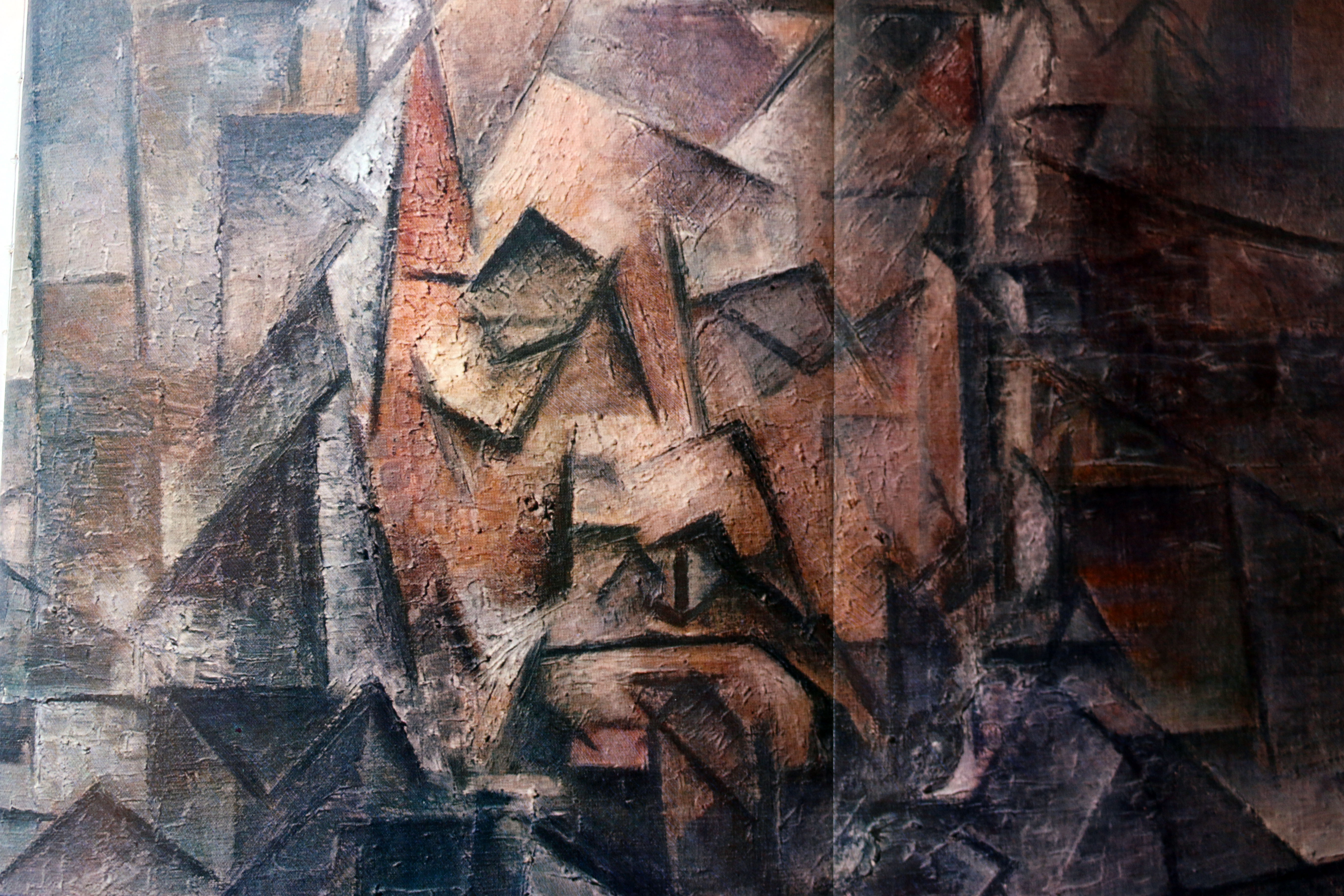 What was immediately clear, was the process of making which Picasso had followed while standing in front of his subject: the process of looking, and focussing on where things meet – where a collar meets a neck, or where a nostril meets a cheek. He has observed closely, synthesized his look into a descriptive mark or two, and deliberately not tried to hide the rough and decisive character of his brushstrokes. Each one stands for a decision made: “The world is made of millions of details, but for now I will make this mark to sum up how a nostril turns”. For this essentially plastic representation, colour is not really needed much: A few local colours – pinky orange for skin, grey and black for almost everything else: suit, wall, space, will suffice. Typical of Analytic Cubism – the early ‘exploratory’ phase of Cubism from around 1910-1914, (the ‘voyage out’ into uncharted territory) – the focus of the painting occupies the centre of the canvas, where most of the energy and directional brushstrokes are concentrated. As the image emerges from its surrounding space, the four extremities or corners of the canvas lose their interest for the painter, and the mark-making tends to ‘fade out’. Eventually, Picasso and Braque realised this, and dispensed with the four corners by painting on oval canvases, so typical of middle and later Cubism.