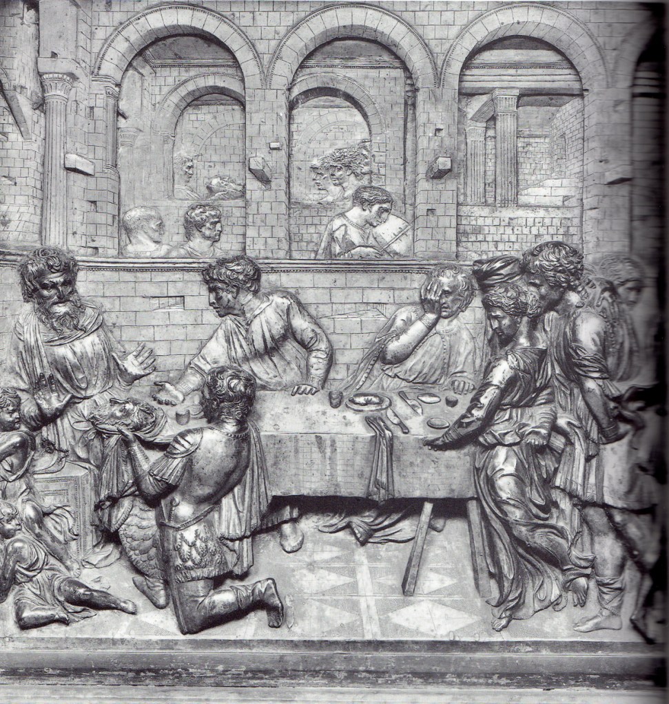 As a close friend of Brunelleschi, Donatello was one of the first to appreciate and master his friend’s invention of single-point perspective, by means of which, a convincingly recessive scene can be created on a flat surface following mathematical principles. Although primarily a pictorial device, this did not deter Donatello, who was consistently experimental throughout his work, from the challenge of using it to create a deeply recessive vista in a shallow relief sculptural plaque. The “Feast of Herod” is a tour-de-force in many respects. The artist creates a series of receding spaces, one for each stage of the narrative, from the furthest set of arches, where the head of St John the Baptist is being presented to Salome and Herodias, to the middle set of arches, where the musician plays and two classically inspired heads listen, forwards to the frontal stage-like space where the feast is occurring and the head is being presented to Herod at table. And yet the bas-relief format is antithetical to deep spatial recession, just as sculpture is inherently not pictorial. Furthermore, the heightened expressivity of the scene – Herod recoils in horror, as does the figure seated next to Herodias, and the swirling draperies of Salome to the right, seem to recall the movement of her dance, and carry forward its expressive movement into the feast scene – function in a way which is pictorial rather than sculptural.