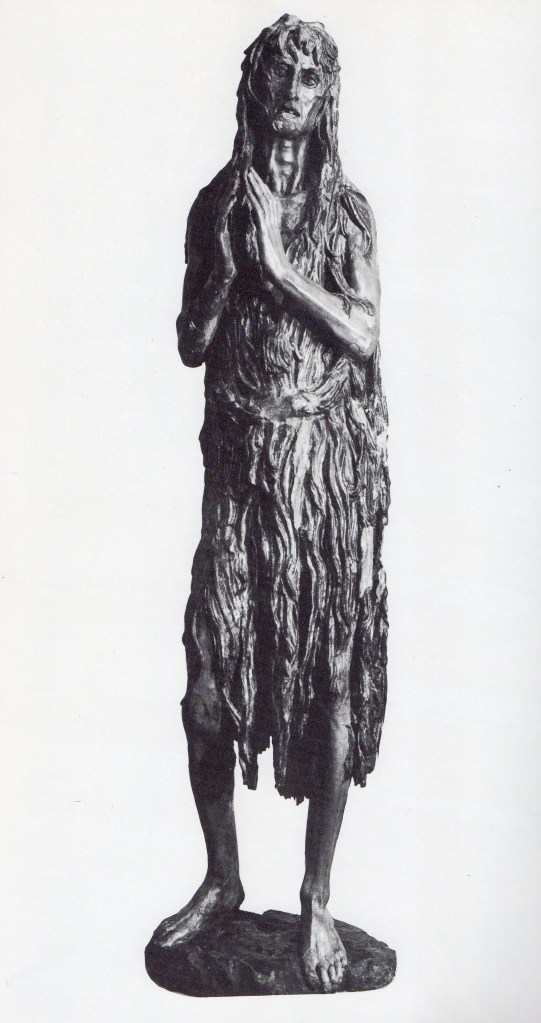 But perhaps his most extraordinary work is the late “Penitent Magdalen” (late 1430-s-50s), in the Museo del Opera Del Duomo, Florence. Carved from wood, with polychromy and gilding, it is an astoundingly modern embodiment of the ravages brought about on the physical body by grief and age. The Magdalen is reduced to an elongated, emaciated, quasi-skeletal figure, her hollow cheeks revealing the bone-structure beneath, and her lank, knotted hair continuing its straggling dishevelled way to cover her body. The Biblical story of Christ at the house of Simon the Pharisee (Luke 7:36-50) recounts how Mary Magdalen, believed to be a beautiful and wealthy harlot, washed Christ’s feet with her tears and dried them with her long hair. Christ declared that she should be pardoned for her previous life. Her story continues with her part in the Passion, and the Golden Legend tells of her life after the Resurrection, when she retreated to the South of France, living a life of fasting and penance as a mountain hermit, clothed only in her own hair. In Donatello’s depiction, her hair is both a symbol of her former beauty and sensuality as well as an emblem of her later repentance and neglect of worldly things.