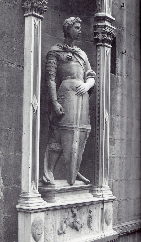 While the “St George” (c.1415-17) for Or San Michele, Florence, depicts a youthful warrior, steadfastly staring out from his niche, ready to boldly confront his adversary. In contrast to the previous example, the St George is standing full square, with weight resting on both legs equally, in a more confrontational pose.