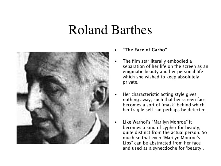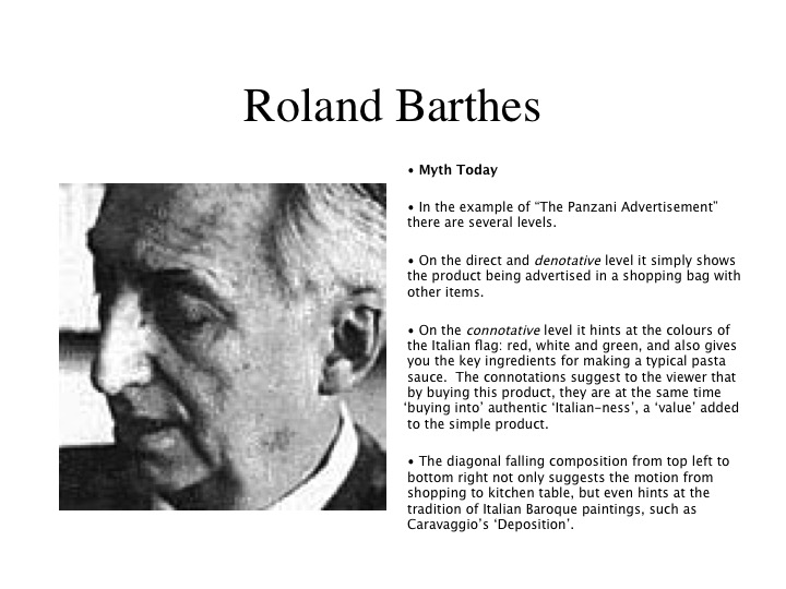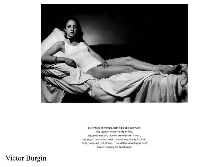 UK photographer, writer and Conceptual artist Victor Burgin (b. 1941) employs semiotics directly in his work. Here drawing on Barthes’ analysis of photography to subvert Manet’s “Olympia” by altering the race of the model and providing a text concerning gender relations, which operates in parallel with the image to help determine its meaning.