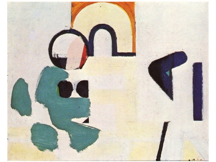 Hodgkin, “114 Sinclair Road” (1957-58) In this painting of a school staff-room, Hodgkin continues this synthesising approach – starting with a fairly ‘readable’ figurative representation of figures sitting around in an enclosed space, and progressively ‘abstracting’ it by an intuitive series of improvisations which move the painting more and more towards abstraction. But the aim is never to loose sight of the original image, like a theme and variations in classical music composition, or a jazz improvisation, the variations only make sense if the original is not lost.
