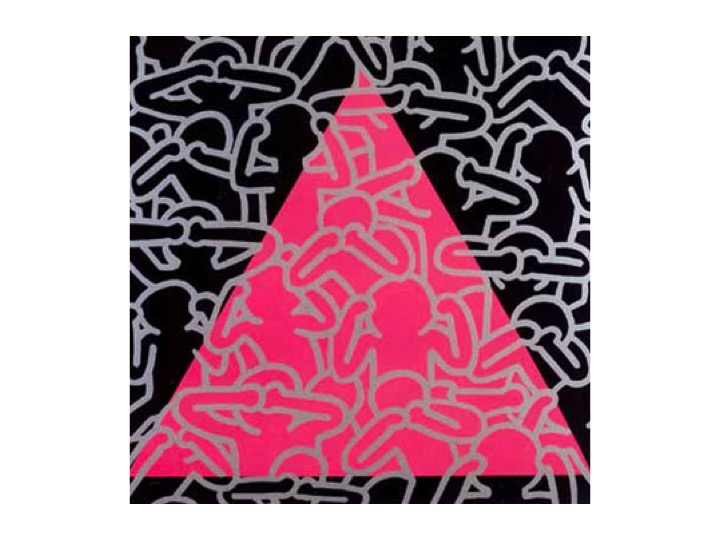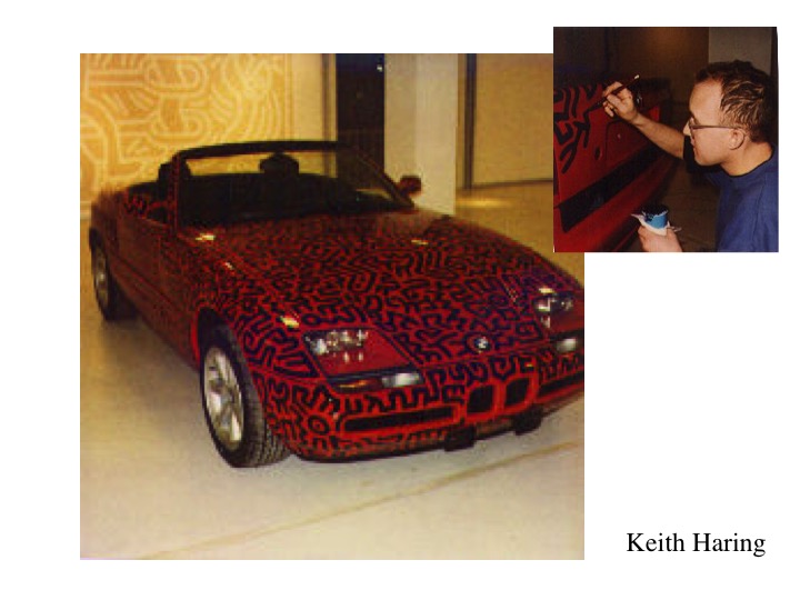 Keith Haring US Pop and Grafiti artist (1958-1990). “Customising a BMW convertible” (1990) and “Silence = Death” (1989). Haring’s work began as anonymous chalk drawings on blacked out advertising panels in the New York Subway. He appropriated these liminal spaces (post and pre-advertising) as a free space to distribute his own unique style of energetic, all-over linear grafiti, populated with strange creatures, space-ships, crawling babies, barking dogs and dancing figures. He was always a political activist, in this work spelling out the importance of reliable information and public awareness in the fight against AIDS, which he himself had contracted and from which he eventually died.