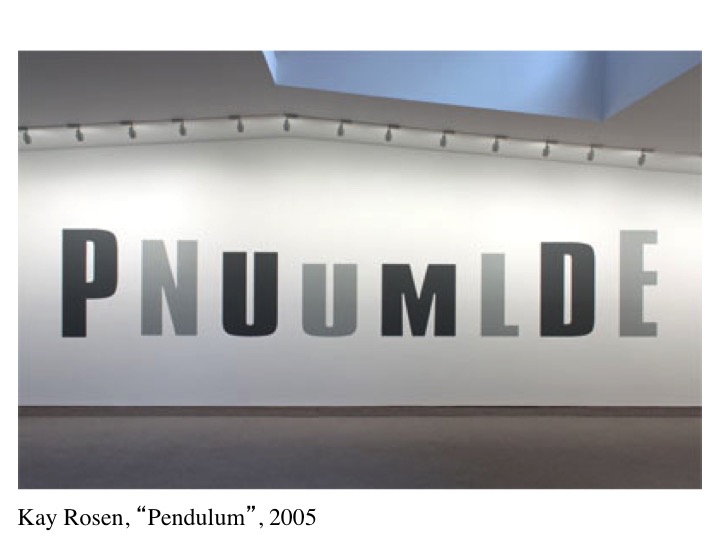 US Conceptual artists Kay Rosen (b. 1943) paints text, usually simple letters, onto gallery walls in site-specific installations. The word thus displayed is presented in such as way as to suggest its meaning through the manner and placing of its depiction. As here in alternating positions and diminishing sizes.