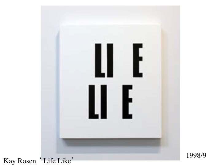 Sometimes, as in “Life Like” (1989/9) the title provides the missing letter and the clue to the painting – a reference to our reliance on texts to ‘explain’ paintings.