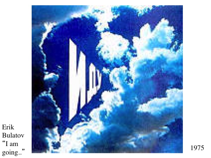 Russian artist Eric Bulatov (b. 1933) is a classically trained figurative painter who combines his representational skills with text – often slogans or brief statements – such as “I am Going” (1975) here, superimposed over a cloudscape in a perspective which enhances the feeling of distance suggested by the words, Bulatov, like many contemporary artists, responded to the feeling at that time that figurative art was no longer sufficient to carry meaning in the face of the conceptual weight of words.