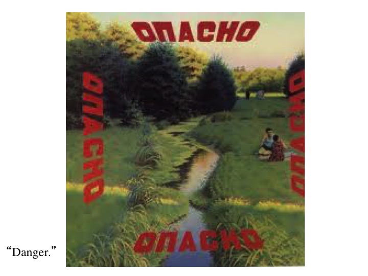In “Danger” the threatening words in red are superimposed on an otherwise idyllic landscape, suggesting the sense of omnipresence of danger in our post-modern world. Is it the peaceful picnic or the traditions of painting that are in danger?