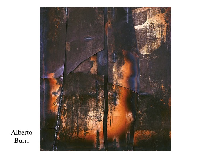 Like the Minimalists, Burri has a preference for the square format – a pure mathematical/Platonic form, and his materials, in this case sheet metal, are usually not interfered with too much (shaped or painted) – but left to show their natural qualities and states.