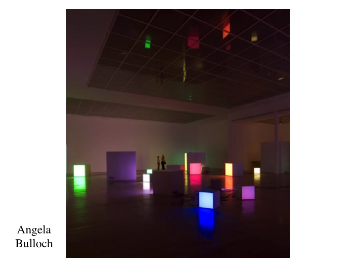 Canadian born artist Angela Bulloch (b.1966) forms part of the YBA (Young British Artists) Group that includes Tracy Emin and Damien Hirst. Her work is often playful and concerned with sound and light installations made from arrangements of sculptural or geometrical elements (squares/cubes) which involve an interactive aspect with the audience, as viewers move around the installation, activating sensors, lights and sounds. She was nominated for the Turner Prize in 1997.