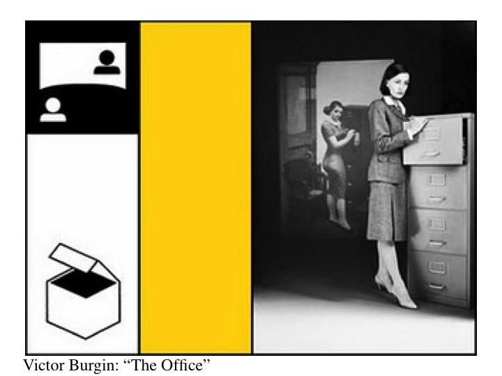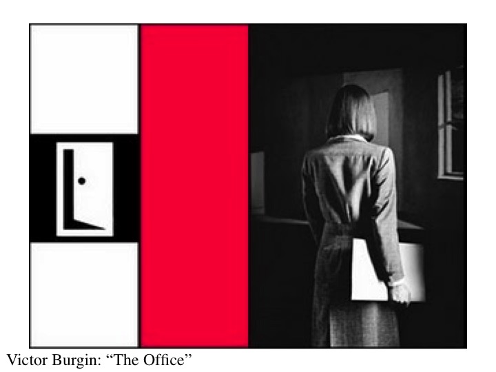 UK Conceptual artist and writer Victor Burgin (b.1941) employs semiotics and photography in his diagrammatic work to explore relations of power and gender in society. The photograph on the right, enacts the (potentially threatening) graphic on the left. A solitary female office worker, approaches a half-open door, at night in an apparently empty office building. Who is behind the door, and is it safe to enter?