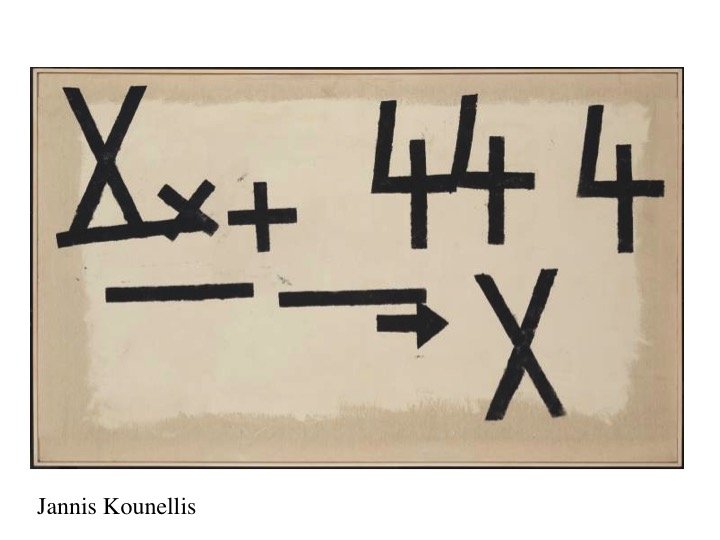 Greek-born Italian artist Jannis Kounellis (1936-2017) formed part of the Italian Arte Povera Group gathered by critic Germano Celant in the 1960s. Another trend in post-war Italian art, under Giuseppe Capogrossi and others, concerned itself with the elementary signifying factor of ‘the sign’ – Here, the painting becomes an arena for the interplay of a proto-linguistic calculation, awaiting our interpretation..It suggests an elementary communication or self-referential structure as in Le Witt’s work..