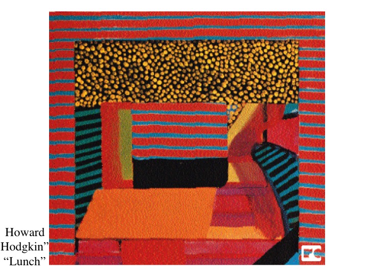 The painting above is from Hodgkin’s early period, when the figurative representations, here, of his friends the painters Anthony Hill and Gillian Wise (Ciobataru). Are still fairly recognisable. In his later work, the abstract improvistaion, (already to be seen in the all-over pattern which is beginning to obliterate the interior space of the room), spreads to the whole painting, like a jazz improvisation upon a theme. It never quite, however, becomes, ‘purely abstract’. Hodgkin represented Britain at the 1985 Venice Biennale and won the Turner Prize in that year.